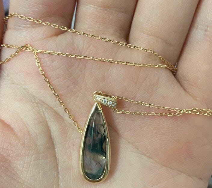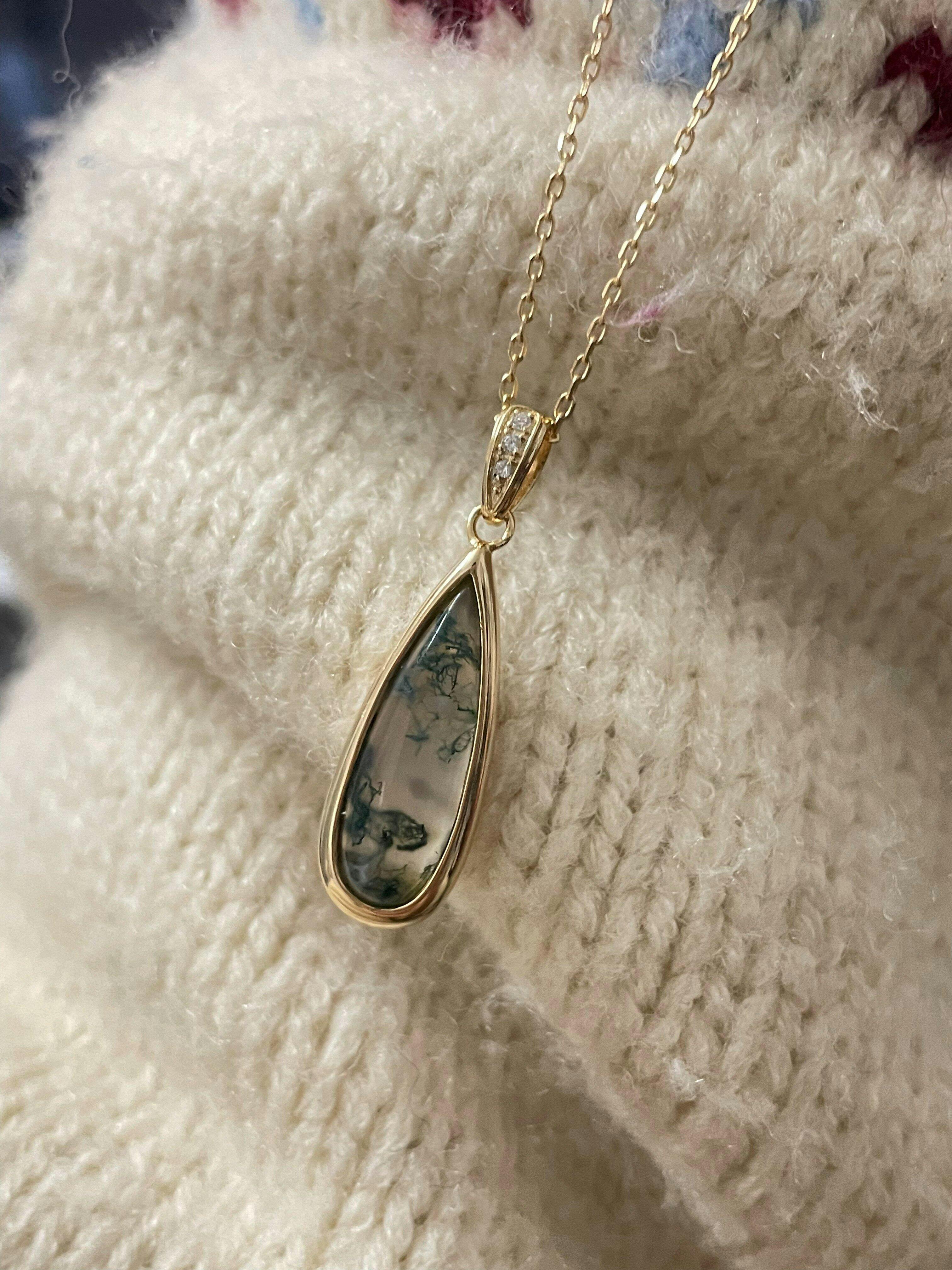 Le collier Willow Drop Cut Moss Agate Classic met en valeur une pierre d'agate mousse taillée avec maestria, alliant textures naturelles et silhouette élégante et raffinée. Ce bijou apporte une touche d'élégance à toutes les tenues grâce à son charme subtil inspiré de la nature et à son raffinement intemporel, ce qui en fait le choix idéal pour celles et ceux qui recherchent un luxe discret.