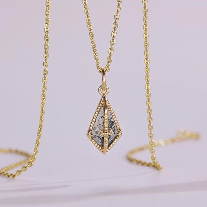 Elevate your collection with the 'Evermoss' necklace, featuring a kite-cut natural green moss agate set in timeless sterling silver. This vintage-inspired piece blends organic beauty with refined craftsmanship, offering a unique accessory that complements both classic and contemporary styles. The intricate moss patterns within the stone create a captivating natural texture, making each necklace one-of-a-kind. Perfect for those who appreciate subtle elegance and distinctive design.