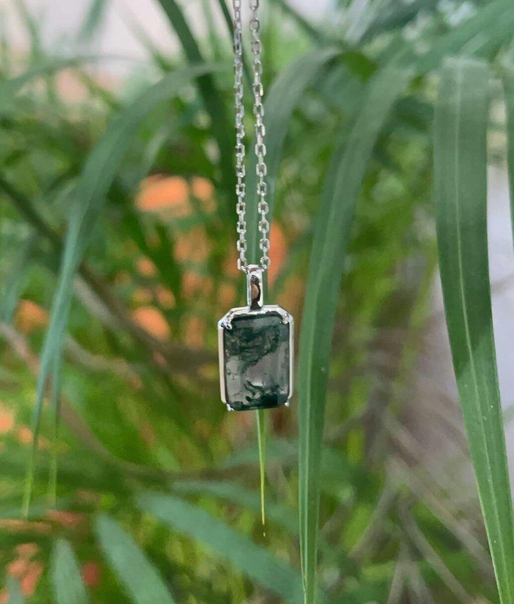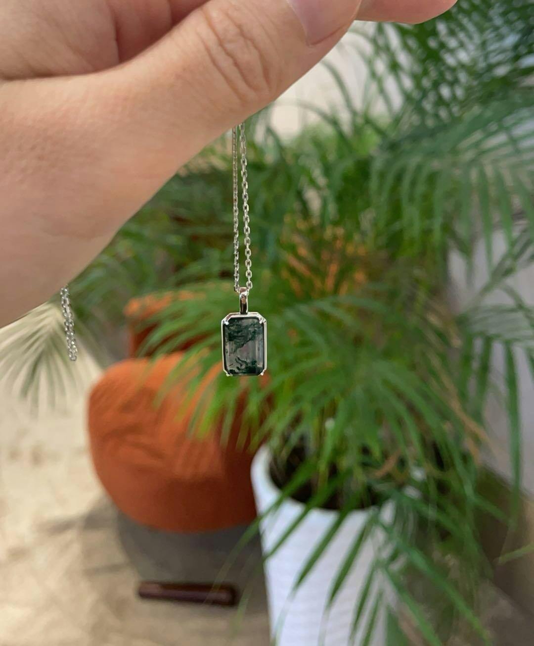 Make a graceful statement with this elongated emerald-cut moss agate necklace, a contemporary classic designed to captivate. The precisely faceted green stone showcases nature's artistry in architectural form, while the extended length creates an elegant drape that flatters any neckline. Avenra is the perfect expression of admiration for your girlfriend—a refined piece that balances modern geometry with organic beauty, ideal for both everyday elegance and memorable occasions.